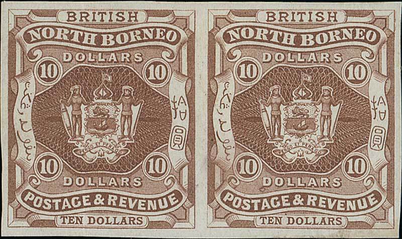 $10 brown imperforate pair, large part original gum; some minor wrinkles, otherwise fine. S.G. 50a, £1,100. Photo