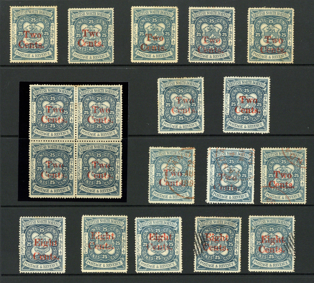2c. on 25c. (11 with a block of four) and 8c. on 25c. (3), unused with part to large part original gum, 2c. on 25c. (3, one a second printing) and 8c. on 25c. (2) used; some with tones and creases though of generally good to fine appearance. S.G. 51, 52, £1,770