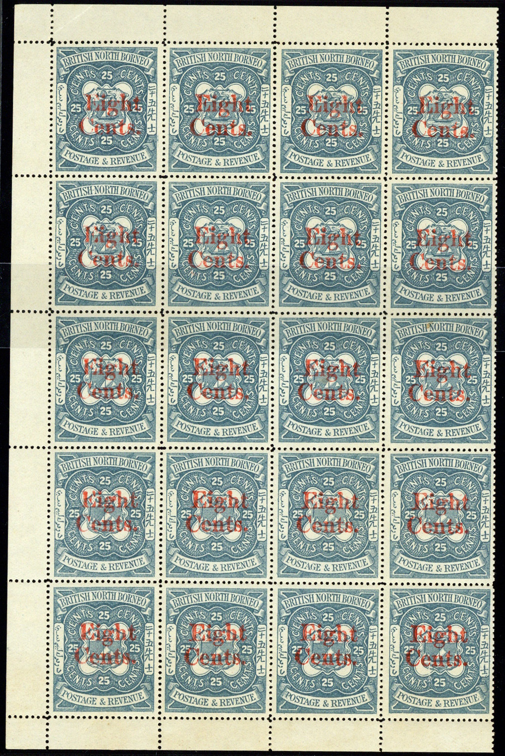 8c. on 25c. indigo first printing block of twenty, being the left-hand four columns of a sheet with full sheet margins, fine unmounted mint. A scarce multiple. S.G. 52, £2,400+