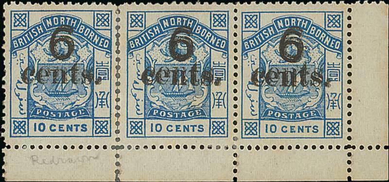 6c. on 10c. blue lower right corner strip of three, variety surcharge treble, the left-hand stamp (severed and rejoined) showing "postage" tablet redrawn, part to large part original gum; trace of light tones. A rare multiple. S.G. 56c, £1,650. Photo