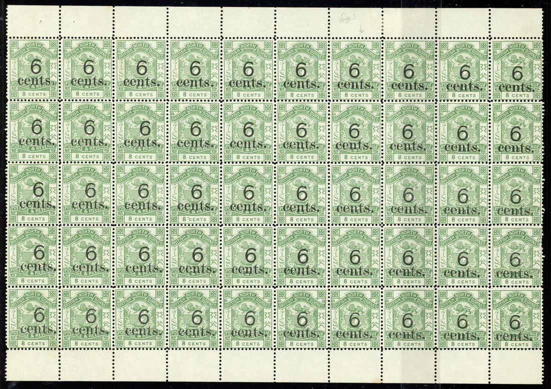 6c. on 8c. yellow-green complete sheet of fifty less the left and right-hand margins, R.3/7 with large "s", fresh unused without gum. A scarce multiple. B.P.A. Certificate (1980). S.G. 55/d, £1,583
