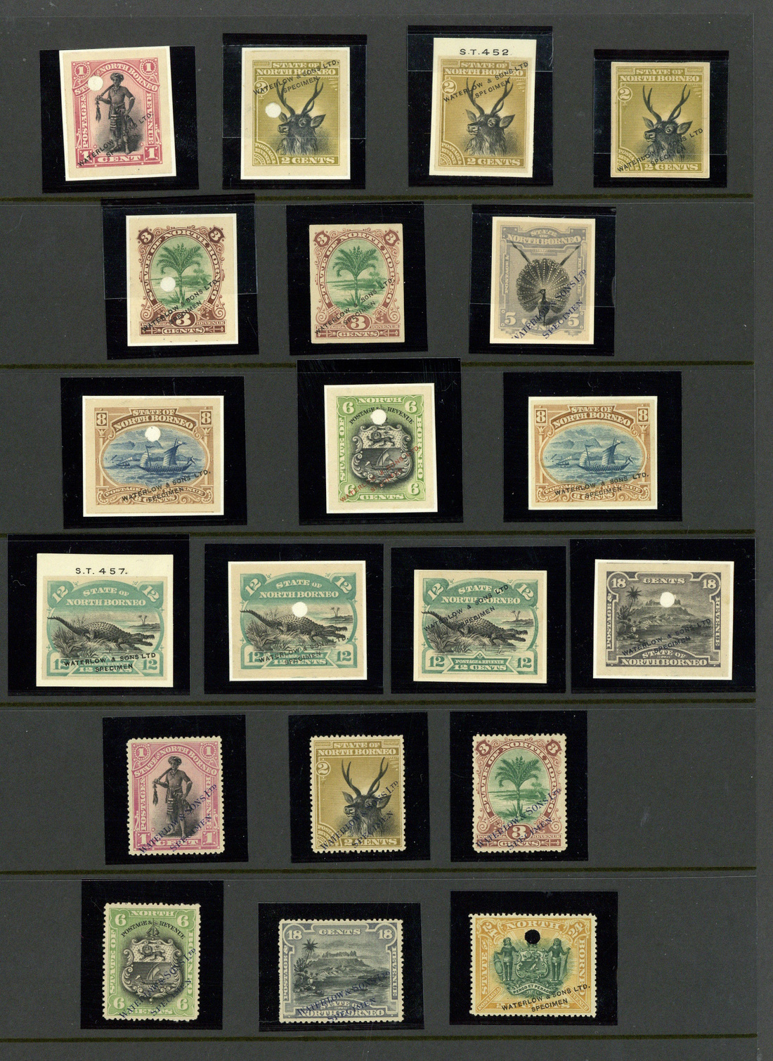 Imperforate 1c., 2c. (3), 3c. (2), 5c., 6c., 8c. (2), 12c. (3) and 24c., and perforated 1c., 2c., 3c., 6c., 18c. and 24c., all overprinted "waterlow & sons ltd./specimen" (one in red and five in blue) and most of the imperforate examples affixed to small pieces, eight with 3mm. punched hole. An attractive group