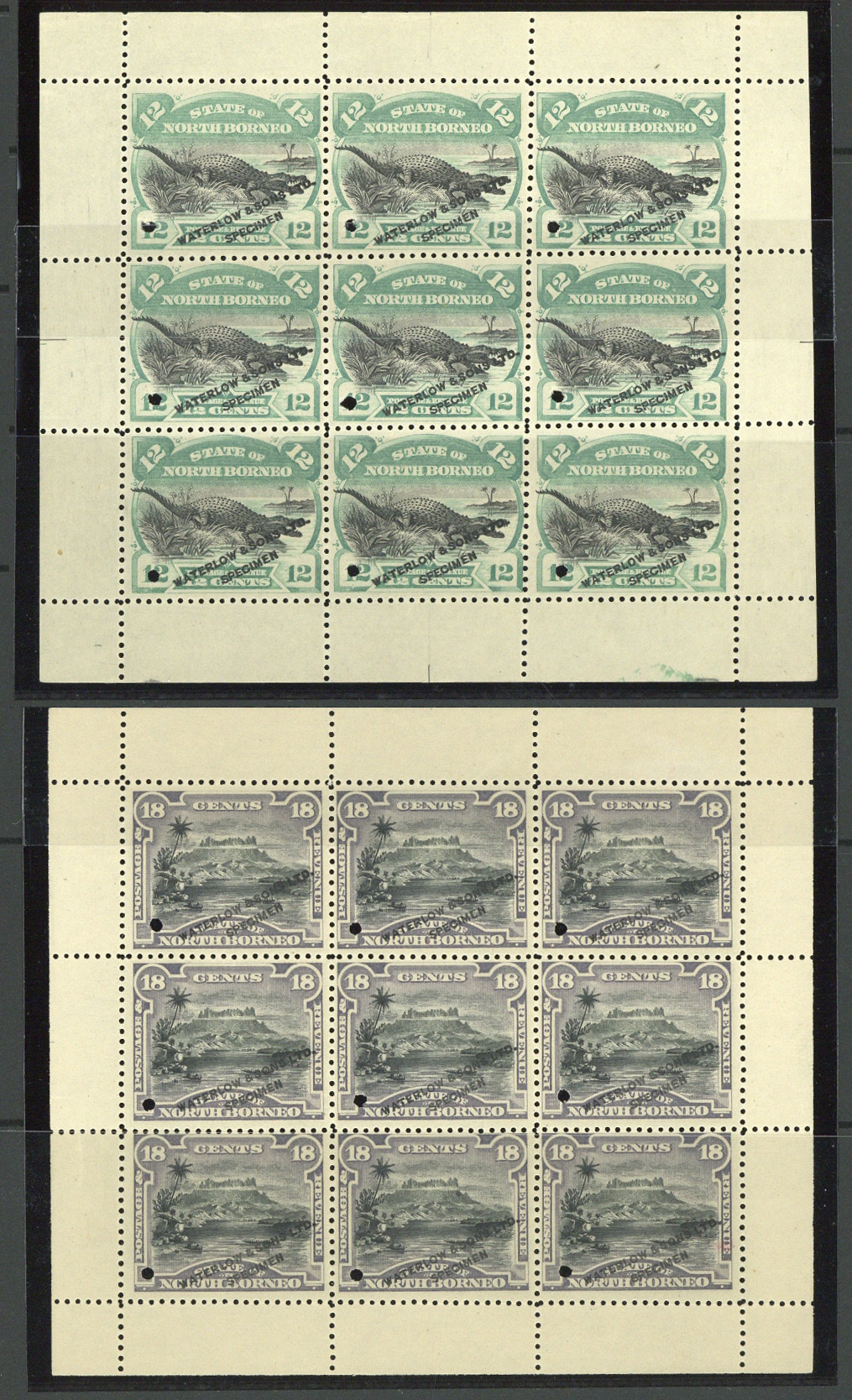 Perforated 1c., 2c., 5c. (two shades), 6c., 8c., 12c. (3, two shades) and 18c., each in a sheet of nine with each stamp overprinted "waterlow & sons ltd./specimen" and with a small punched hole. A most attractive group