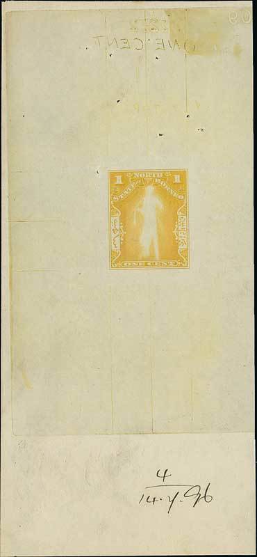 1c. progressive die of the frame showing outline of the area for the vignette, in pale yellow-ochre on wove paper (68x148mm.) showing reversed die numbers and "one cent", dated "14.7.96" at foot; a few pinholes at top clear of the design. Photo