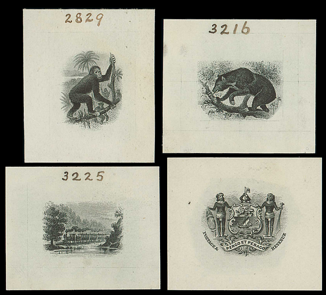 4c., 10c., 16c. and 24c. vignettes, each in black on wove paper, the first three with die number in manuscript at top. A unique and most attractive group. Photo