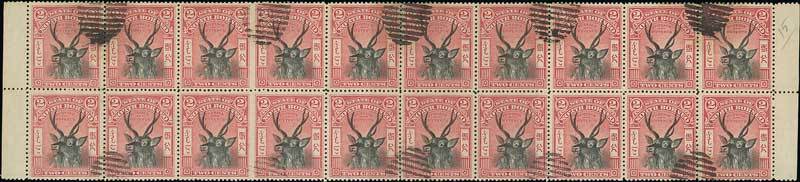 2c. black and lake block of twenty (10x2) with margins at both sides, columns 4 and 5 variety imperforate between, neatly cancelled-to-order; fine and a rare positional multiple. S.G. 94/ab, £1,300+. Photo