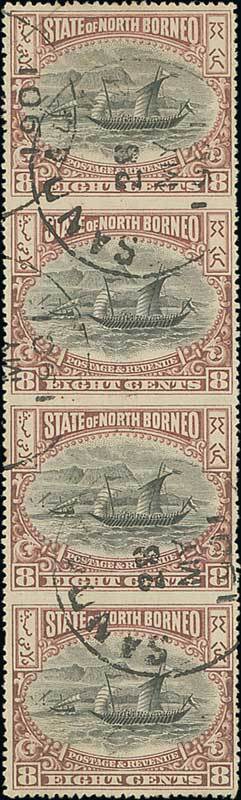 8c. black and brown-purple vertical strip of four, variety imperforate between, neatly cancelled by Sandakan c.d.s.; closed tear at foot, otherwise sound. S.G. 102ab var. Photo