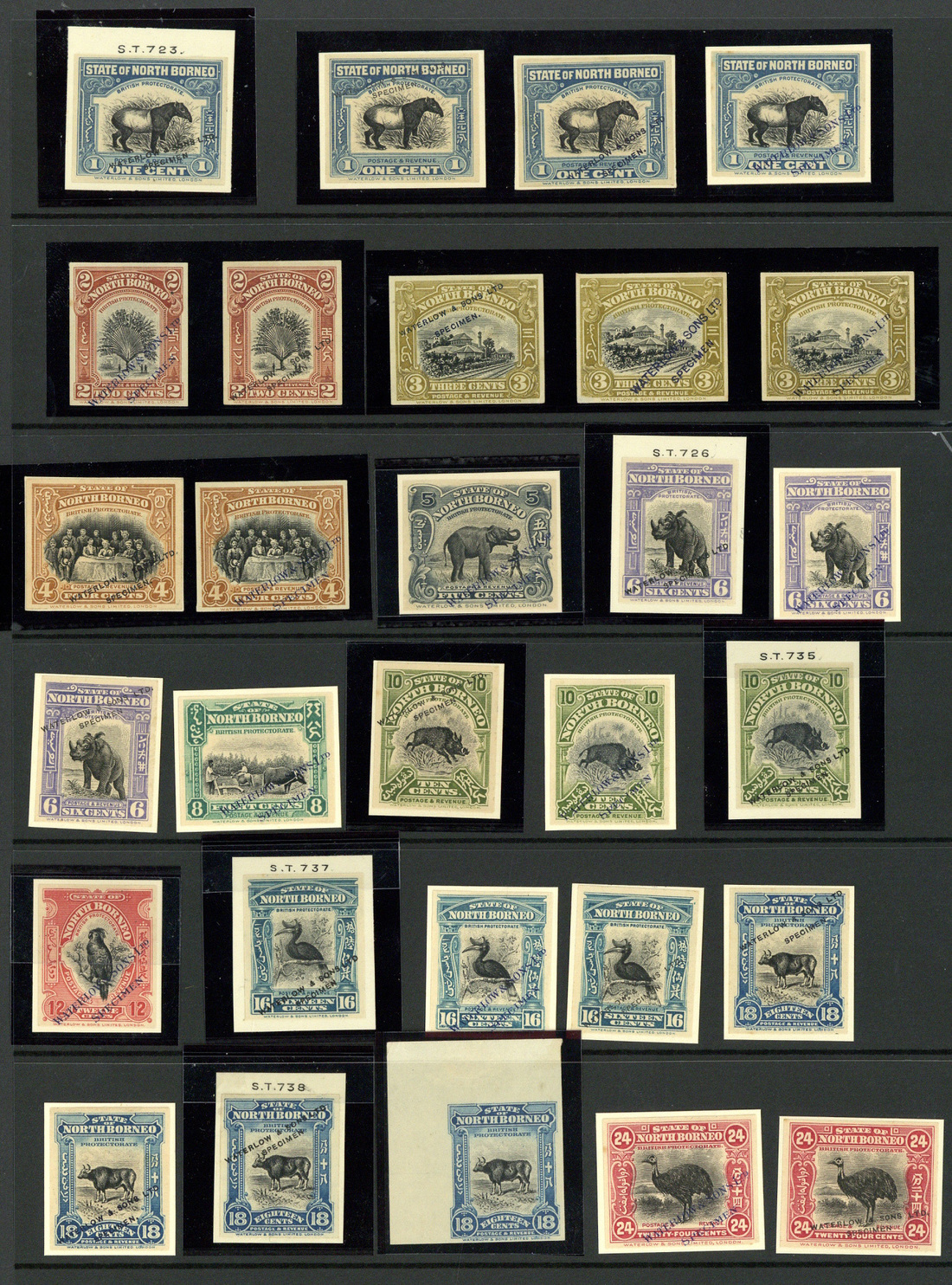 1c. (4), 2c. (2), 3c. (3), 4c. (2), 5c., 6c. (3), 8c., 10c. (3), 12c., 16c. (3), 18c. (3) and 24c. (2), all imperforate and overprinted "waterlow & sons ltd./specimen" in black or blue in three different types, nearly affixed to pieces with a few showing reference numbers; also 18c. corner example unoverprinted. A most attractive group