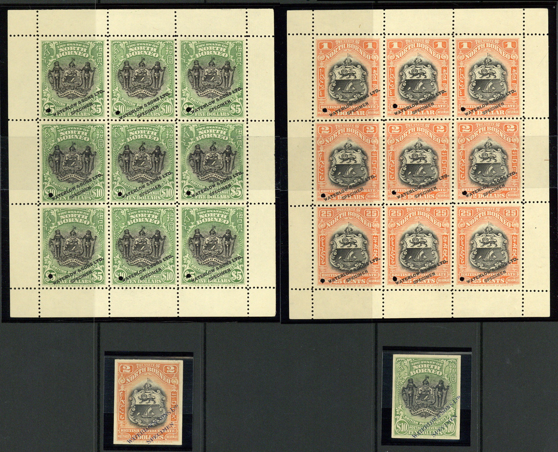$2 black and orange and $10 black and yellow-green, both imperforate and overprinted "waterlow & sons ltd./specimen" in blue, $2 and 410 perforated sheets of nine, both with each overprinted "waterlow & sons ltd./specimen" and with a small punched hole at lower left
