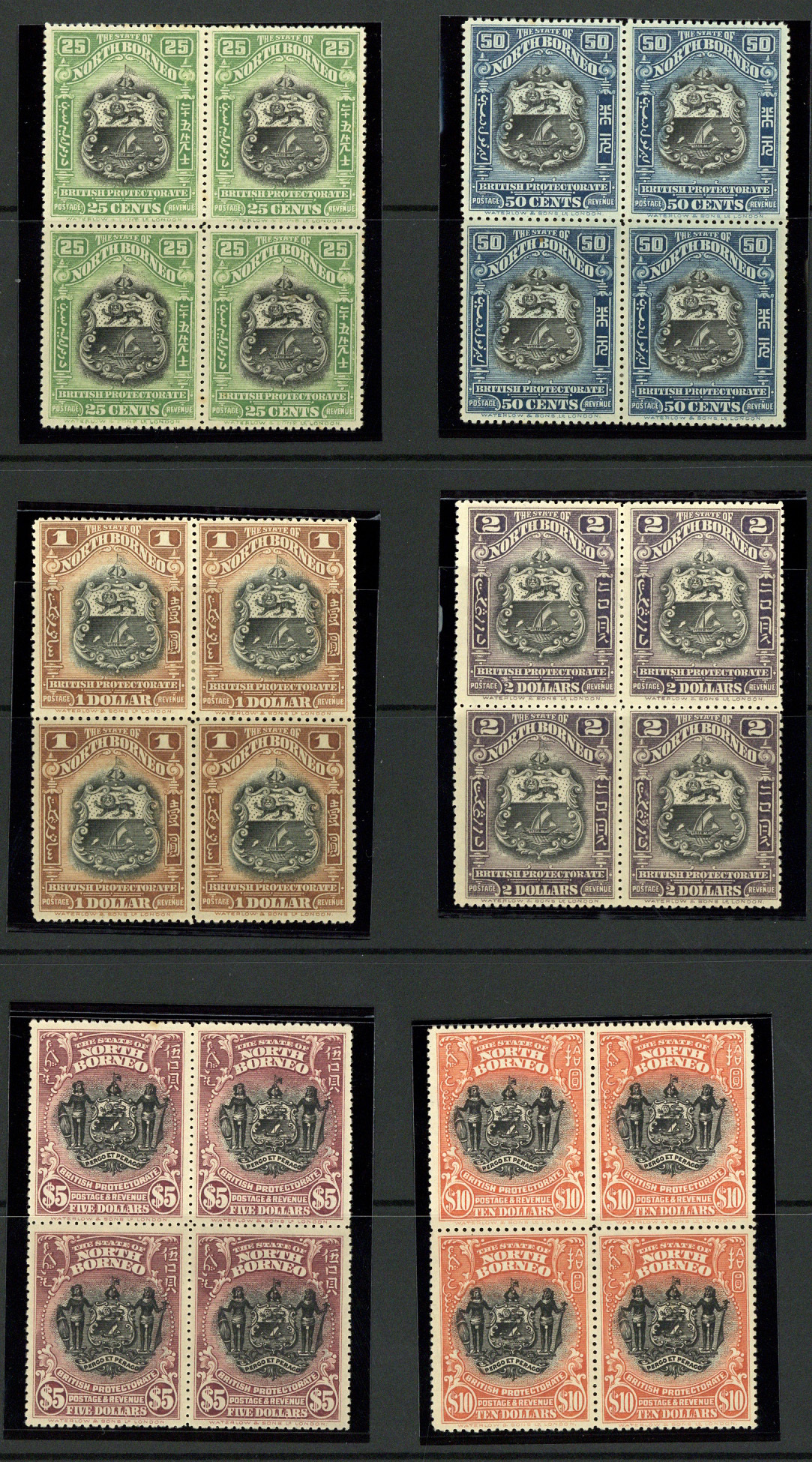 25c. to $10 set of six in blocks of four, mint; one $5 with a foxed perf., though generally fine. Cat. £3,600+