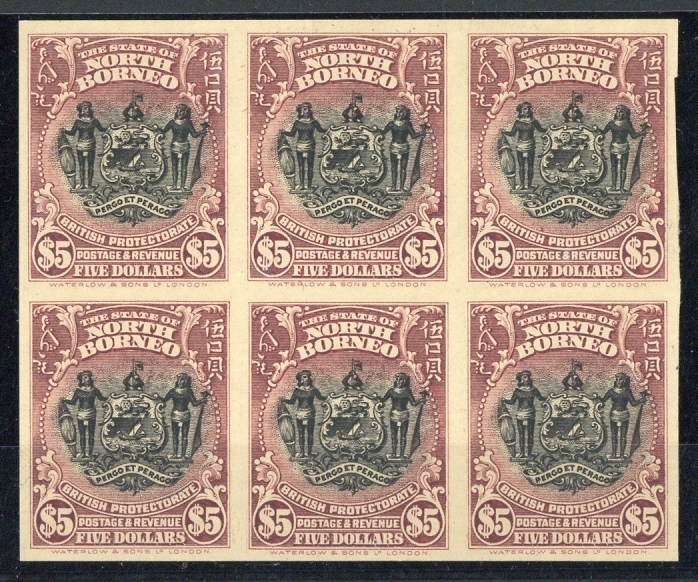 $5 black and lake block of six (3x2), variety imperforate, without gum. S.G. 182a, £675
