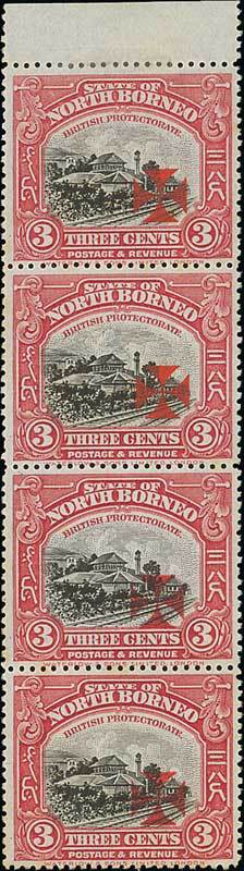 Note: This combination of overprints on the same sheet was discovered amongst a parcel of sheets allocated to the National Philatelic War Fund, and was sold for the benefit of the Red Cross and St. John's Ambulance. Details of its discovery are more fully described in "The Stamps and Postal History of North Borneo", Part 3, by Shipman and Cassels