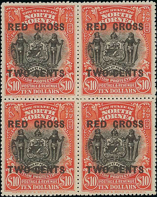$10 black and brick-red block of four, large part original gum with a central hinge mark. A rare multiple. S.G. 234, £2,400+. Photo