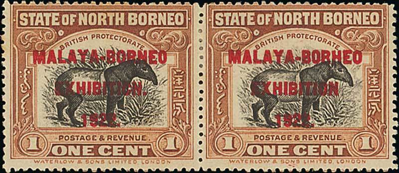 1c. black and brown with red overprint, perf. 14½-15 horizontal pair, the left-hand stamp variety "exhibiticn" with stop, the right-hand stamp variety "borheo", fine mint. Scarce. S.G. 253fa/fd, £1,350+. Photo