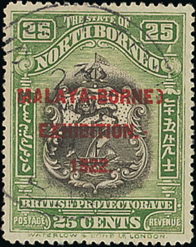 25c. black and yellow-green, perf. 14½-15, variety stop after "exhibition", and with damaged "o" of "borneo", fine used with light Jesselton c.d.s.. S.G. 274da, £450. Photo