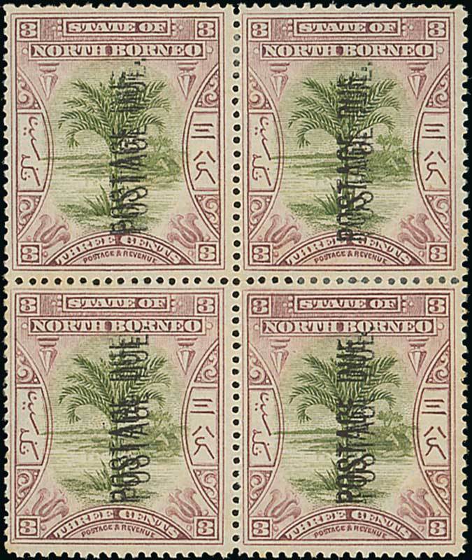 3c. green and dull mauve block of four, variety overprint double, fresh with part original gum; some horizontal perfs. severed and re-inforced. S.G. 27a, £1,100. Photo