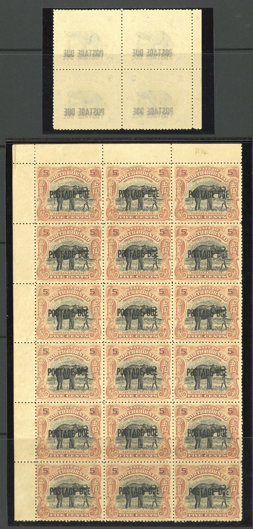 5c. black and yellow-brown block of four with overprint at foot, variety offset of overprint on reverse, fresh unmounted mint, and 5c. black and orange-brown with overprint at centre upper right corner block of eighteen (3x6), unmounted mint with brownish gum,. S.G. D57 var., D58