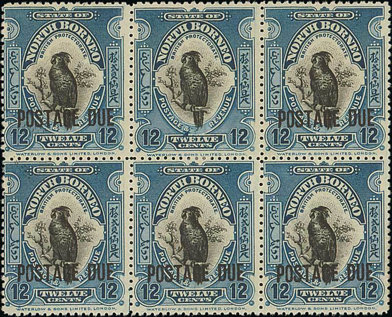 12c. black and deep blue block of six (3x2), the top strip variety one without overprint, fresh mint; partial gum loss at centre due to hinge removal, and one normal with a thin spot, otherwise fine, A major Postage Due rarity. S.G. D64/a, £14,000. Photo