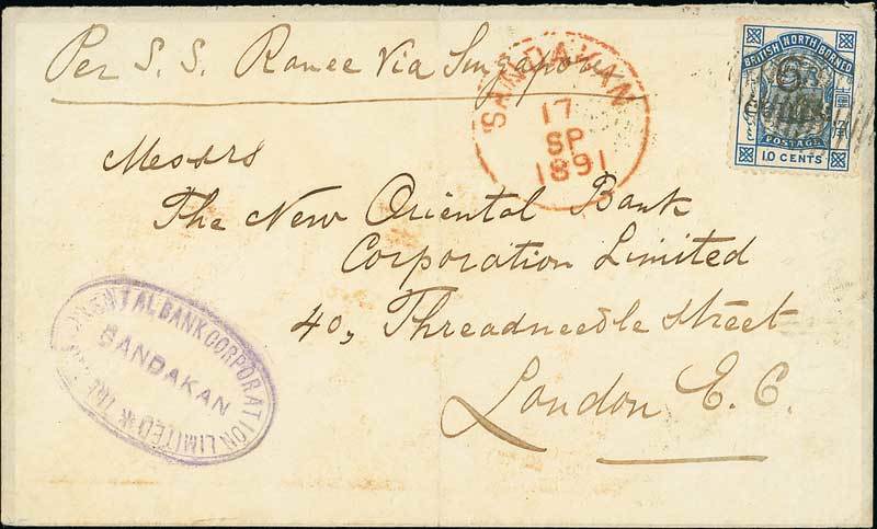 1891 (17 Sept.) envelope from Sandakan "Per S.S. Ranee Via Singapore" to London, bearing 1891 6c. on 1886-87 10c. blue tied by 14 bar oval and showing despatch c.d.s. in red alongside, Oriental Bank senders cachet in lower left corner; vertical fold at centre. Photo