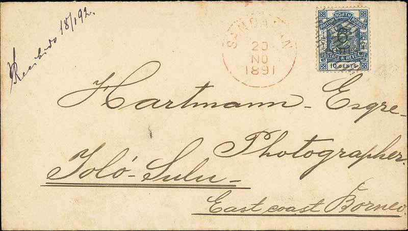 1891 (20 Nov.) envelope from Sandakan to Jolo in the Sulu Islands, Philippines, bearing 1891 6c. on 1891 10c. blue tied by 17 bar oval and with despatch c.d.s. in red alongside, fine. Photo
