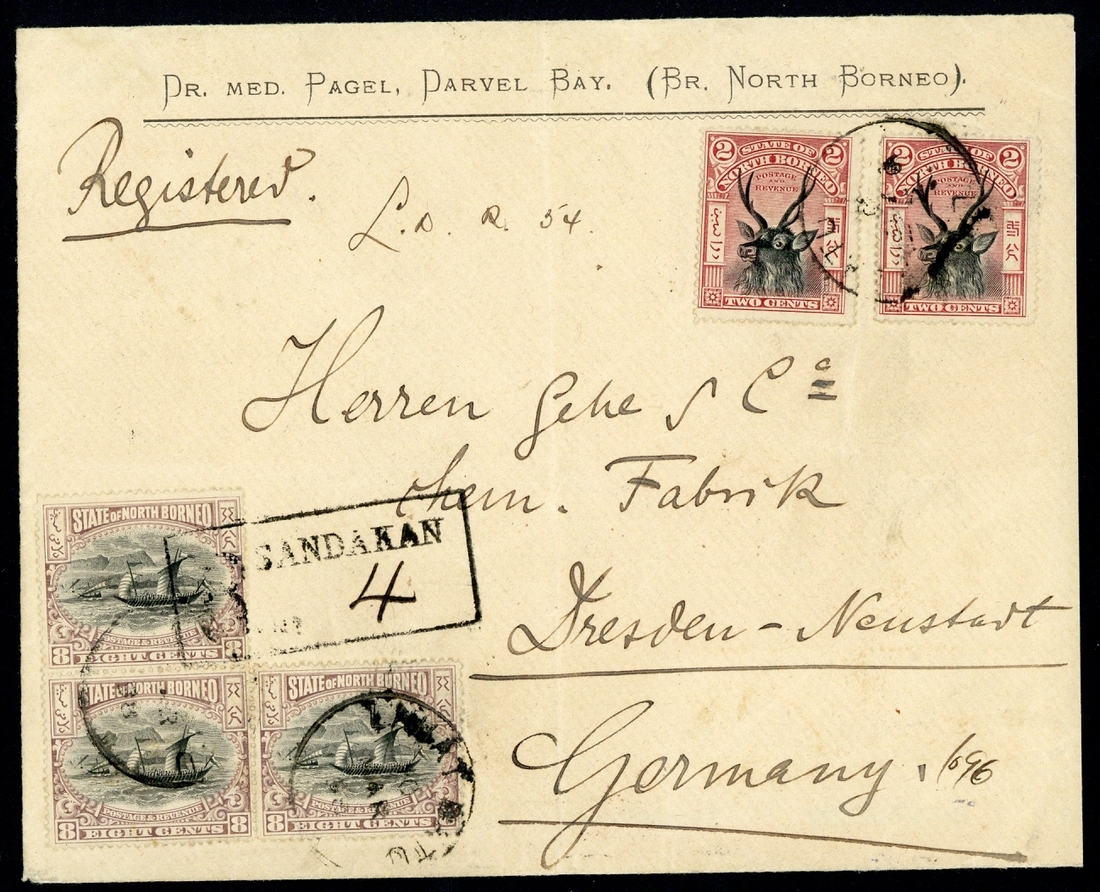 1898 (Mar.) envelope registered from Lahat Datu to Germany, bearing 1897 Pictorial 2c. (2) and 8c. (3) with c.d.s., one 8c. additionally tied by Sandakan registration handstamp, Sandakan and Dresden c.d.s. on reverse; vertical crease at centre though an attractive franking