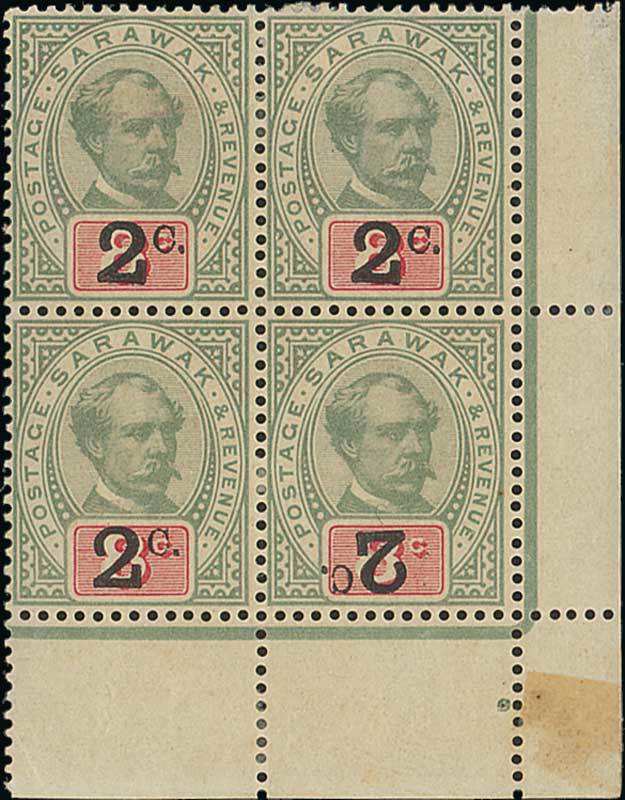 2c. on 8c. green and carmine lower right corner block of four, the lower right corner stamp variety surcharge inverted, part original gum; overall toning. Very rare. B.P.A. Certificate (1986). S.G. 24, 24b, £4,250+. Photo