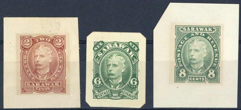 2c. in red-brown, 6c. in green and 8c. in green, all on wove paper with various size margins and each affixed to card