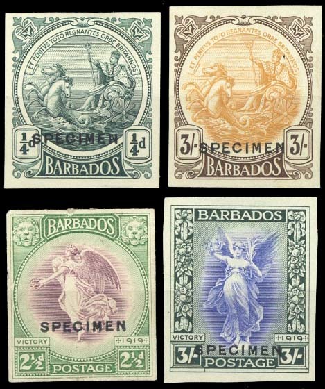 1916-19 issue ¼d. blue-green and 3/- yellow-orange and brown, and 1920-21 issue 2½d. maroon and yellow-green and 3/- blue and deep green, all overprinted "specimen" (DS1, DS2); the 2½d. with small faults, otherwise fine
