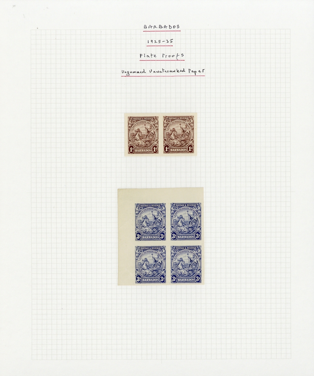 imperforate plate proofs: 1d. horizontal pair in brown and 3d. upper left corner block of four in deep blue, both on ungummed unwatermarked paper; fine