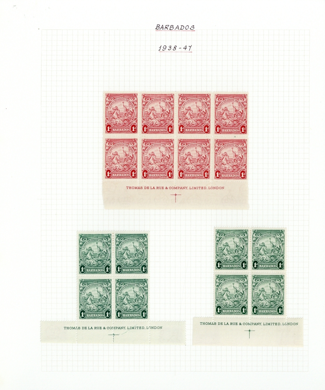 1937 Coronation set in blocks of four, 1938-47 range of blocks of four or eight to 5/-, 1939 Tercentenary, 1946 Victory, 1947 1d. on 2d. (both perfs.), 1948 Wedding, 1949 UPU, 1950 Definitives, 1951 University and 1952 Stamp Centenary sets in blocks of four, all with imprint and/or plate number; fine mint. Cat. £780+