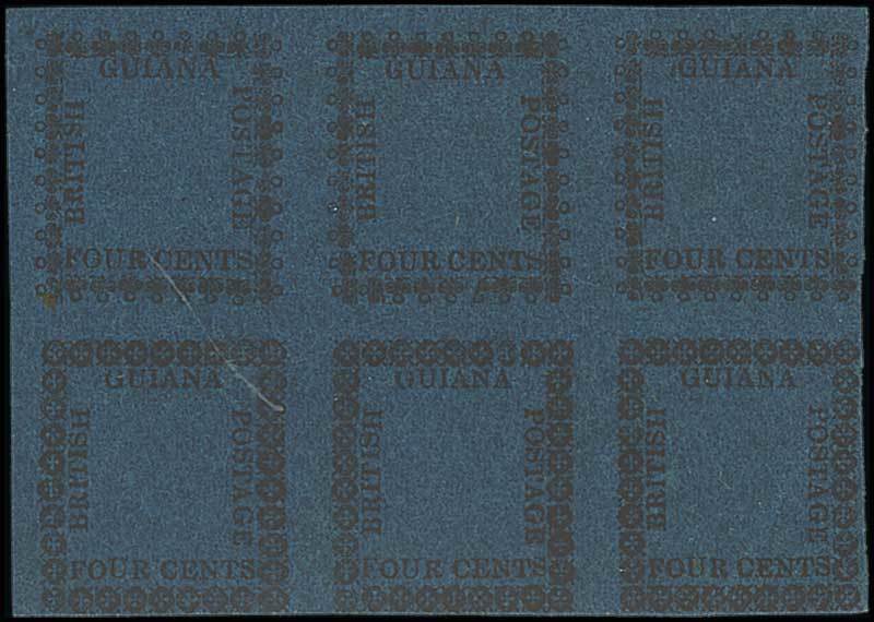 1862 (Sept.) Type-set, 4c. blue unsigned block of six (3x2), Rows 3/4, 4-6, comprising Types 15 above 14, unused without gum; corner crease at lower right. A rare multiple. B.P.A. Certificate (2007). S.G. 123a, 124a, £8,100+. Photo