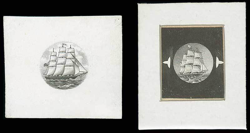 A specialised group of vignette die proofs tracing the various changes that were required in the run-up to the design being accepted, all in black on glazed card with varying degrees of uncleared surround and comprising fourteen (all 92x60mm.) dated between "Oct. 21, 1875" and "Nov. 19, 1875", two stamp-size inset on card and an engraved die proof of a similar sailing ship on wove paper (41x36mm.). A remarkable group, accompanied by photographs of two similar proofs in the Royal Philatelic Collection, illustrating the fine detail that was undertaken for this issue. Photo
