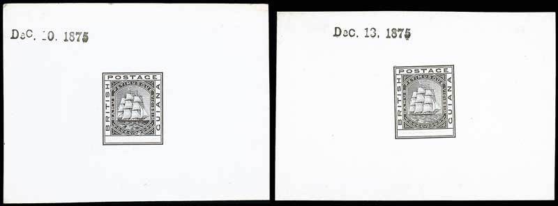 A specialised group of master die proofs, all in black on glazed card and comprising nine (all 82-92x60mm.) with seven dated between "Dec. 10, 1875" and "Dec. 17, 1875", and one stamp-size inset on thick card . A remarkable group, accompanied by photographs of two similar proofs in the Royal Philatelic Collection, illustrating the fine detail that was undertaken for this issue. Photo
