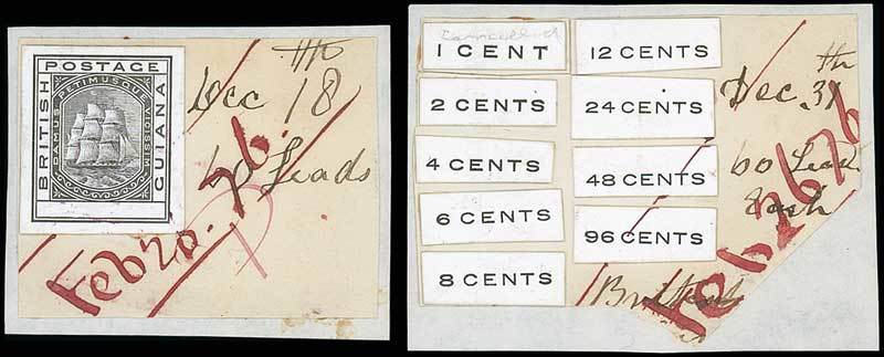Master and nine value tablets (the 1c. in essay form without serifs and marked "Cancelled" in pencil), all in black on two De La Rue day book pieces dated "Dec. 18th" and "Dec. 31st." respectively and with details of leads taken, both further dated "Feb 26 76" in red ink. A unique pair. Photo