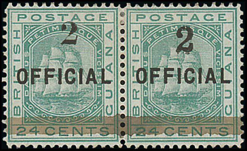 1881 (28 Dec.) Surcharges on Official stamps, "2" on 24c. emerald-green horizontal pair comprising S.G. Types 23 and 24 se-tenant, unused with large part original gum. Fine and rare. B.P.A. Certificate (2007). S.G. 157a, £1,900. Photo