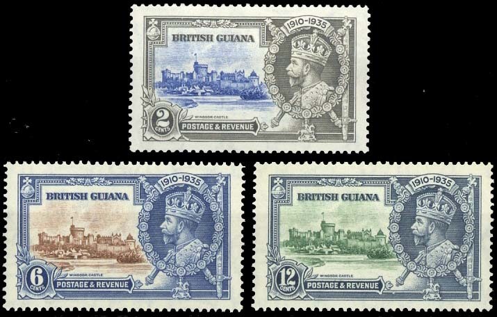 1935 Silver Jubilee 2c. dot by flagstaff, 6c. dot to left of chapel and 12c. diagonal line by turret, mint; the 6c. and 12c. with off-white gum. S.G. 301h, 302g, 303f, £430