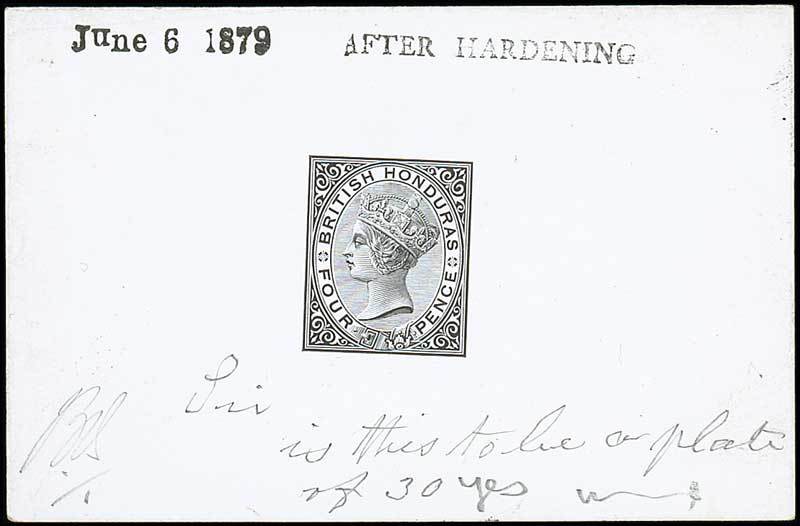4d. in black on glazed card (92x60mm.), marked "before hardening" and dated "June 6 1879", initialled at lower left corner and subsequently marked "Sir is this to be a plate of 30", the reply "Yes" initialled by Warren William De La Rue. A remarkable proof. Photo
