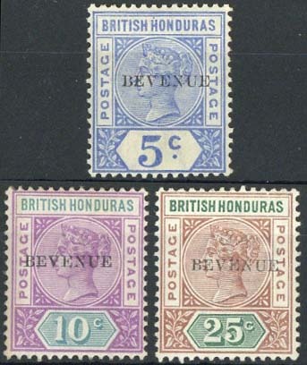 5c., 10c. and 25c., all variety "bevenue", fine mint. S.G. 66a-68a, £730