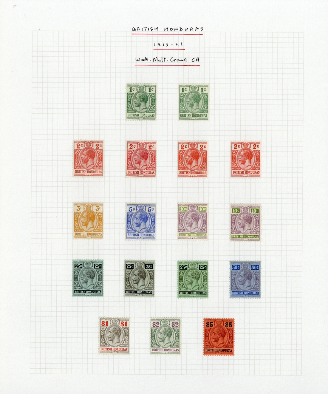 1913-21 set with seven shades to 35c., 1915-16 set with additional 1c., 1916-18 War Stamps (7), 1921 2c., 1921 1c., 1922 4c., 1922-33 set with 5c. shade and 1932 Belize Relief Fund set in singles and blocks of four, good to fine mint. Cat. £1,160