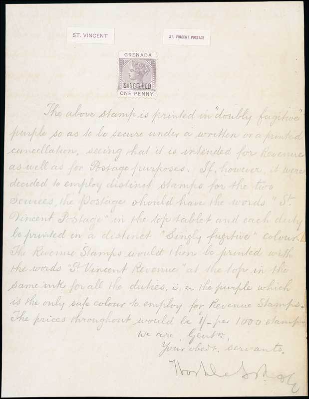1882 (24 Nov.) copy of letter written on sheet (160x208mm.) bearing Grenada 1883 design 1d. in purple but without "postage", perforated 12 and handstamped "cancelled" (Type D7), together with proofs on small pieces of plain paper of the "st. vincent" and "st. vincent postage" tablets, both in purple. Photo