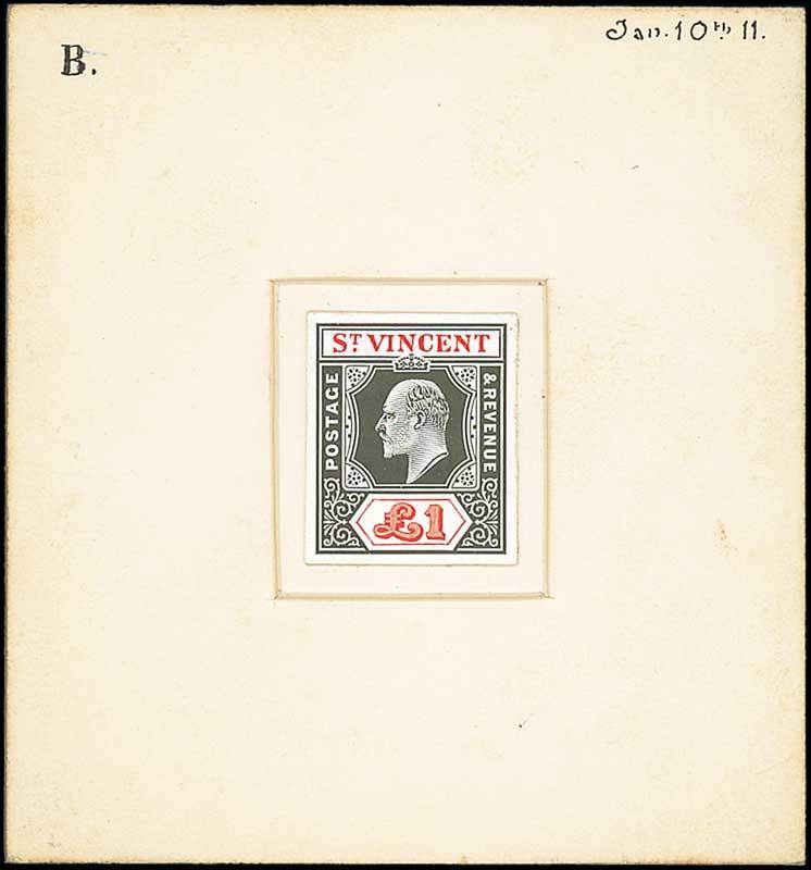 £1, the frame printed in black, and the name and the value tablets handpainted in red, inset on thick card (78x84mm.), marked "B" and dated "Jan. 10th 11". Highly desirable. Photo