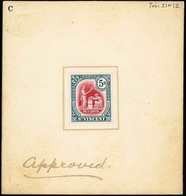 5/- composite type in red and green, stamp-size on glazed card in a design similar to that issued but the value expressed "5s", some handpainting between vignette and frame, inset on thick card (85x91mm.) marked "C", "approved" and dated "Febr 21st 12". Most attractive. Photo