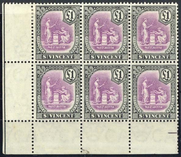 £1 mauve and black lower left corner block of six (3x2), fresh and fine mint. S.G. 120, £660