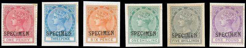 1d., 3d., 6d., 1/-, 5/- and £1, each handstamped "specimen" (D8) and each affixed to small piece (6d. non-contemporary), perfs. trimmed at base of 6d. A very rare set. Photo