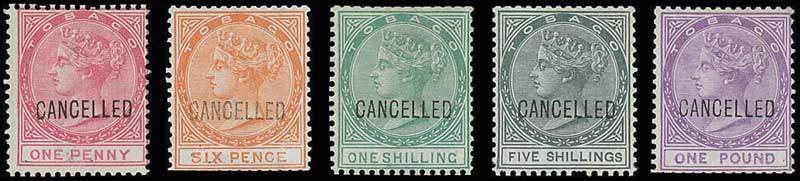1d., 6d., 1/-, 5/- and £1, each handstamped "cancelled " (D7), the 5/- with some gum; perfs. trimmed in places. A very rare group. Photo