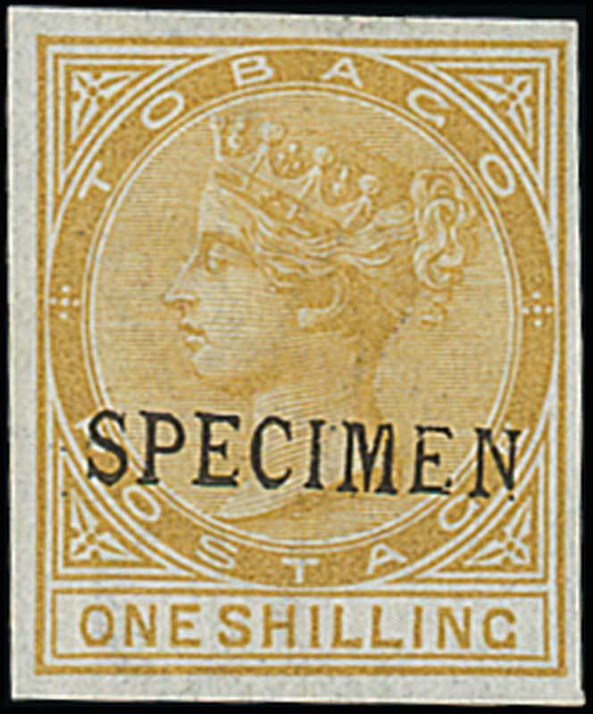 1/- yellow-ochre overprinted "specimen" (D8), fresh with large part original gum; very fine. Photo