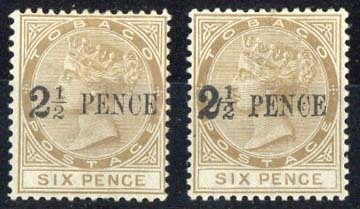 1883 (Apr.) "2½ pence" on 6d. stone, two examples, one variety large "2" with long tail, part and large part (variety) original gum. S.G. 13, 13b, £290