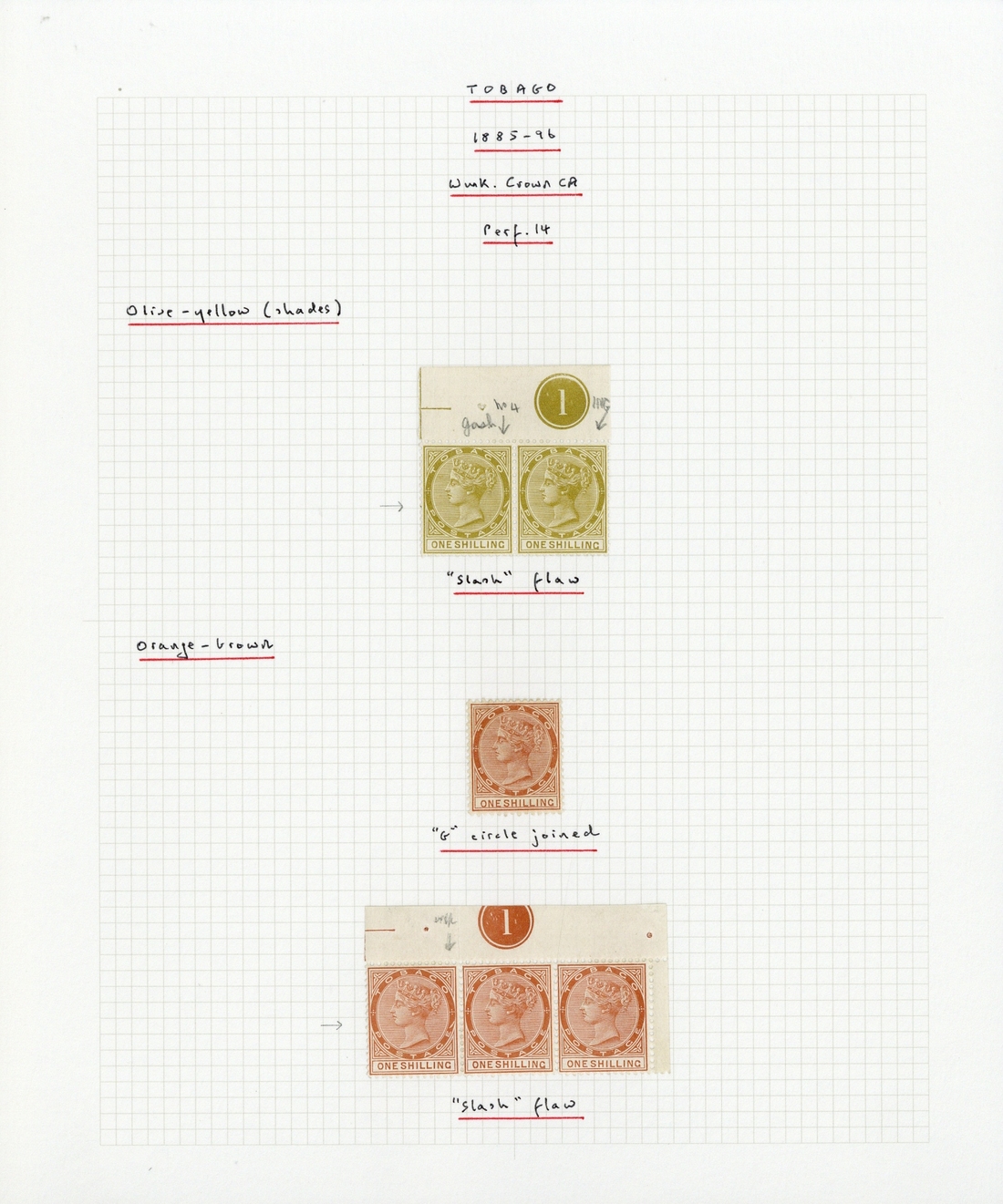½d., 1d., 4d., 6d. (2), 1/- olive-yellow plate number pair and 1/- orange-brown corner plate number strip of three, all with "slash" flaw, 4d. and 6d. with variety "slash" flaw repaired, and 1/- orange-brown with variety "g" joined to circle, mint and generally fine. Cat. £1,715+