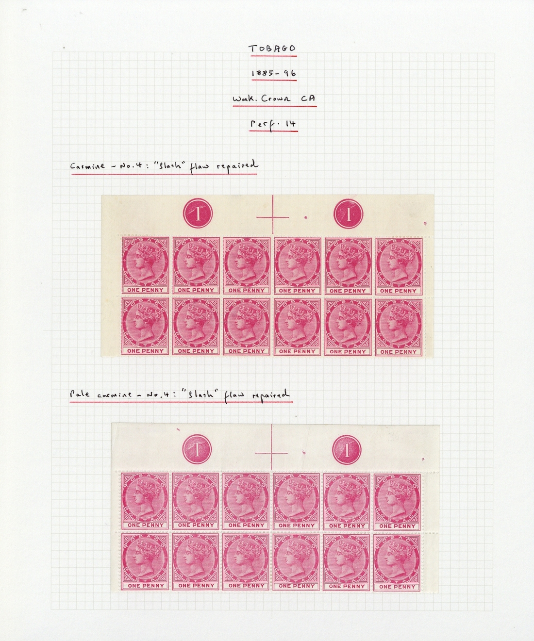 1d. carmine and 1d. pale carmine plate number blocks of twelve (6x2) from the top of the pane, both [4] showing variety "slash" flaw repaired, fine mint. S.G. 21ab, £454+