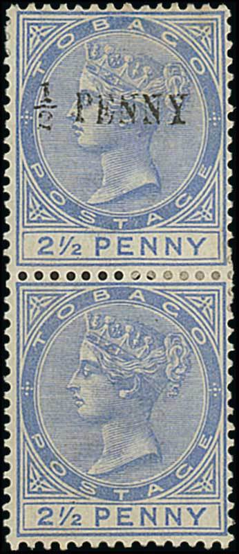 "½ penny" on 2½d. dull blue vertical pair, variety lower stamp surcharge omitted, large part original gum. Extremely rare with only six such pairs recorded. B.P.A. Certificate (2007). S.G. 26c, £15,000. Photo